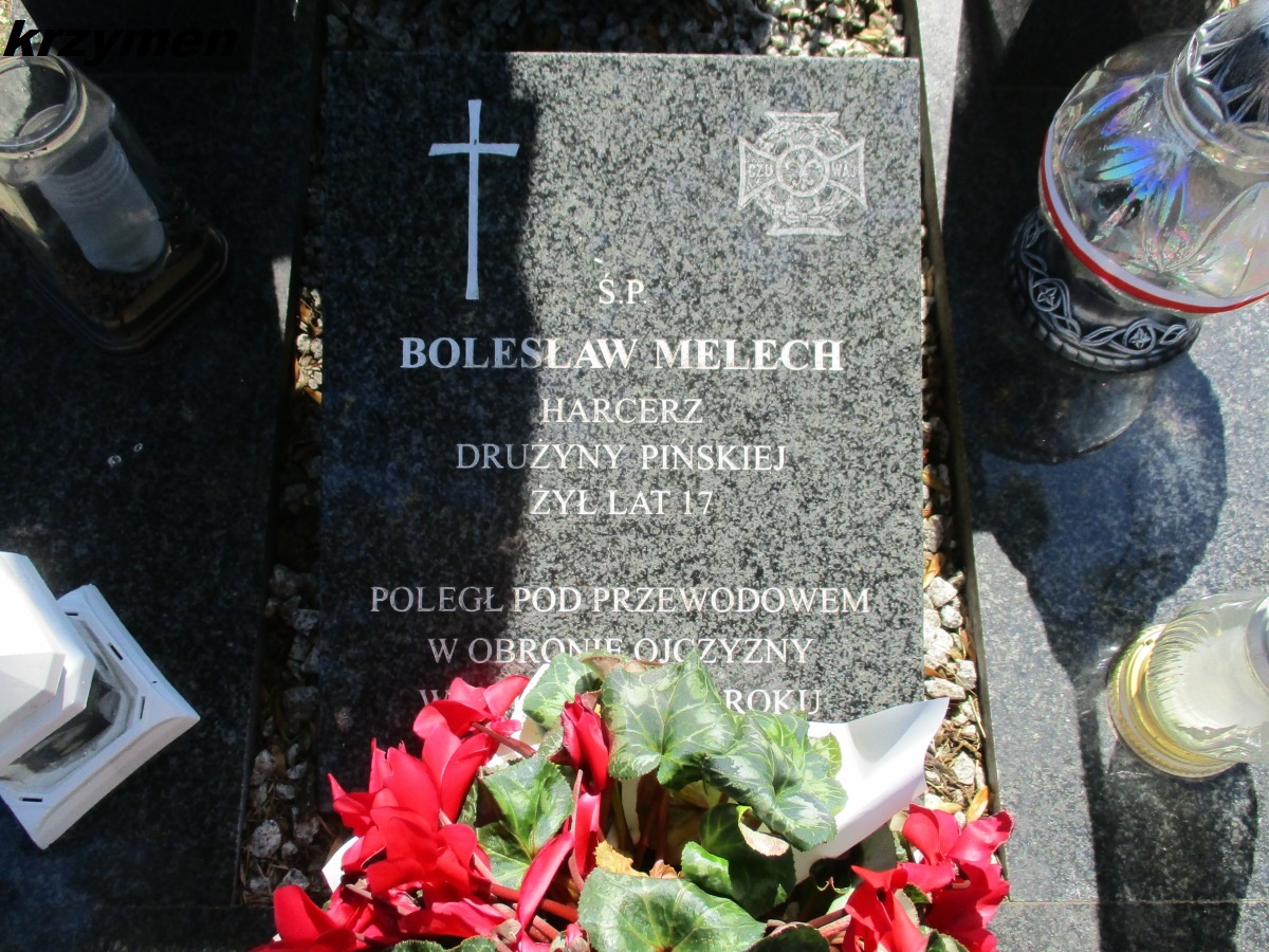 Mogiła szer. Bolesława Melecha znajduje się po lewej stronie, w rogu cmentarza. Bolesław Melech, ur. 08.01.1903 r., był drużynowym pińskiej drużyny harcerskiej. Służył w 2 kompanii 205 ochotniczego pułku piechoty. Poległ pod Przewodowem 11.08.1920 r.