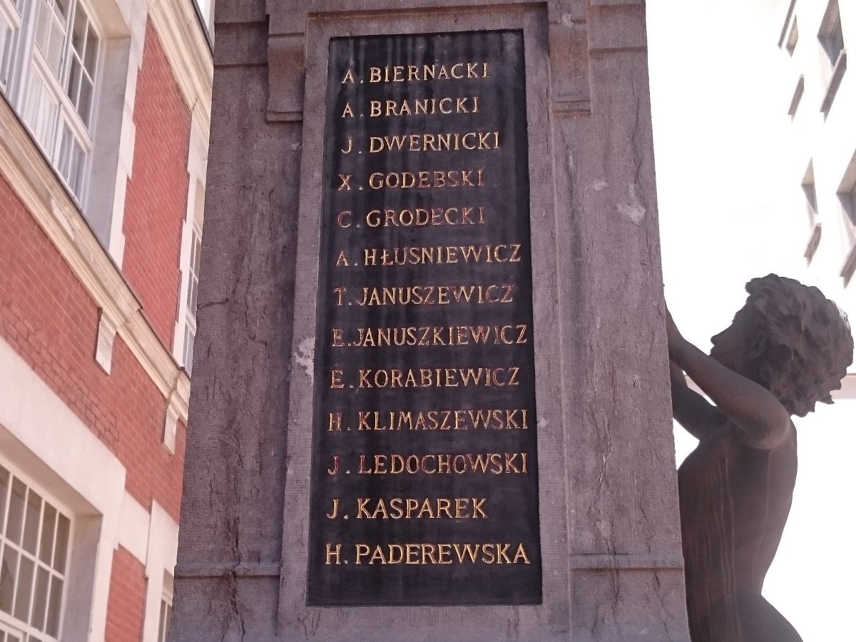 W 1879 r. wzniesiono tu pomnik Seweryna Gałęzowskiego, długoletniego przewodniczącego Rady Szkolnej. Na bocznych ścianach pomnika umieszczono tablice z nazwiskami dobroczyńców i fundatorów wspierających szkołę.