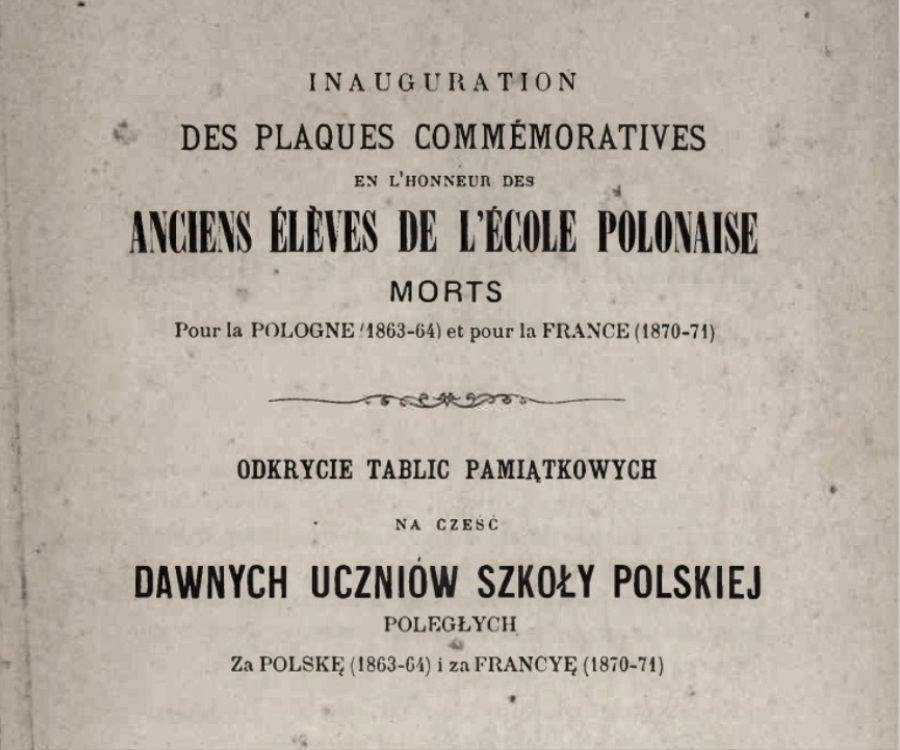 - Inauguration des plaques commémoratives en l’honneur des anciens élèves de l’Ecole polonaise morts pour la Pologne (1863–64) et pour la France (1870–71). Odkrycie tablic pamiątkowych na cześć dawnych uczniów Szkoły Polskiej poległych za Polskę (1863–64) i za Francję (1870–71), (1877).