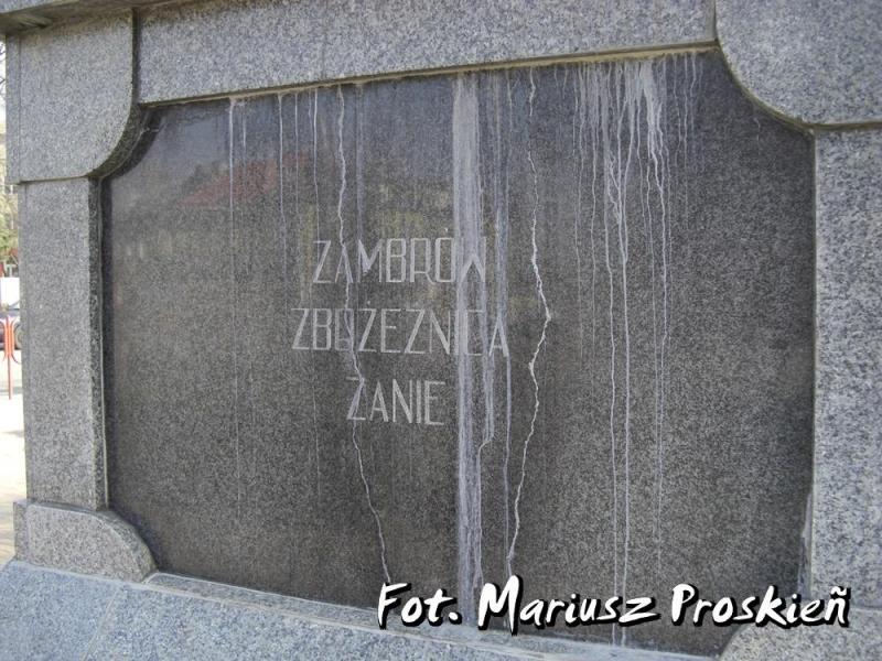"W HOŁDZIE • POLEGŁYM POWSTAŃCOM • 1863-64 •• SREBRNY BOREK • MĘŻENIN • SZLASY LIPNO •• ZAMBRÓW • ZBOŻEŹNICA • ZANIE •• ZBUDOWANY w 1930 • ZBURZONY PRZEZ OKUPANTA w 1940 • ODBUDOWANY w 1993".