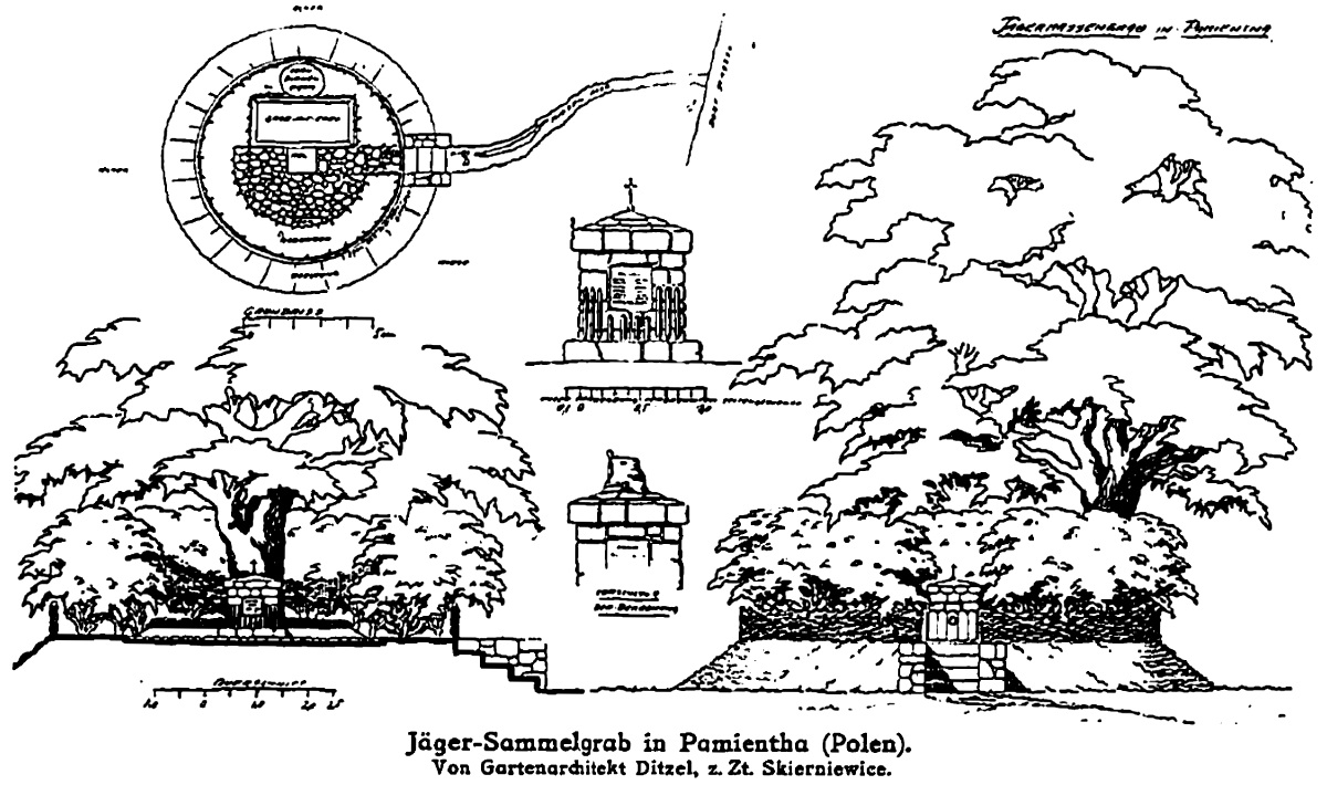 Projekt Jäger-Sammelgrab (mogiła strzelców) wykonał w 1917 roku niemiecki architekt krajobrazu Ditzel.