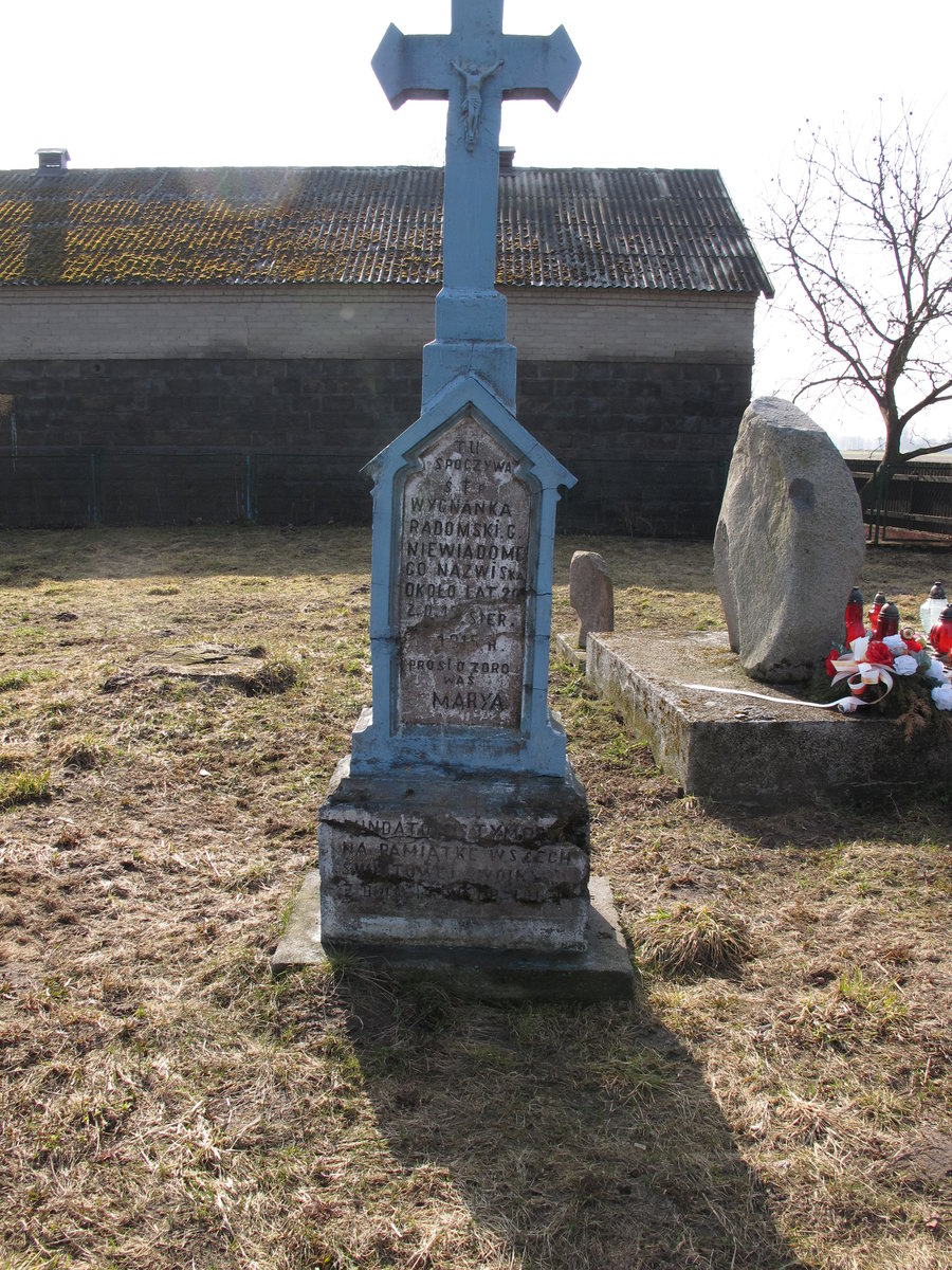 ”TU • SPOCZYWA • Ś. † P. • WYGNANKA • RADOMSKI. G. • NIEWIADOME • GO NAZWISKA • OKOŁO LAT 20 • Z. D. 15? SIER. • 1915 R. • PROSI O ZDRO • WAŚ • MARYA”.