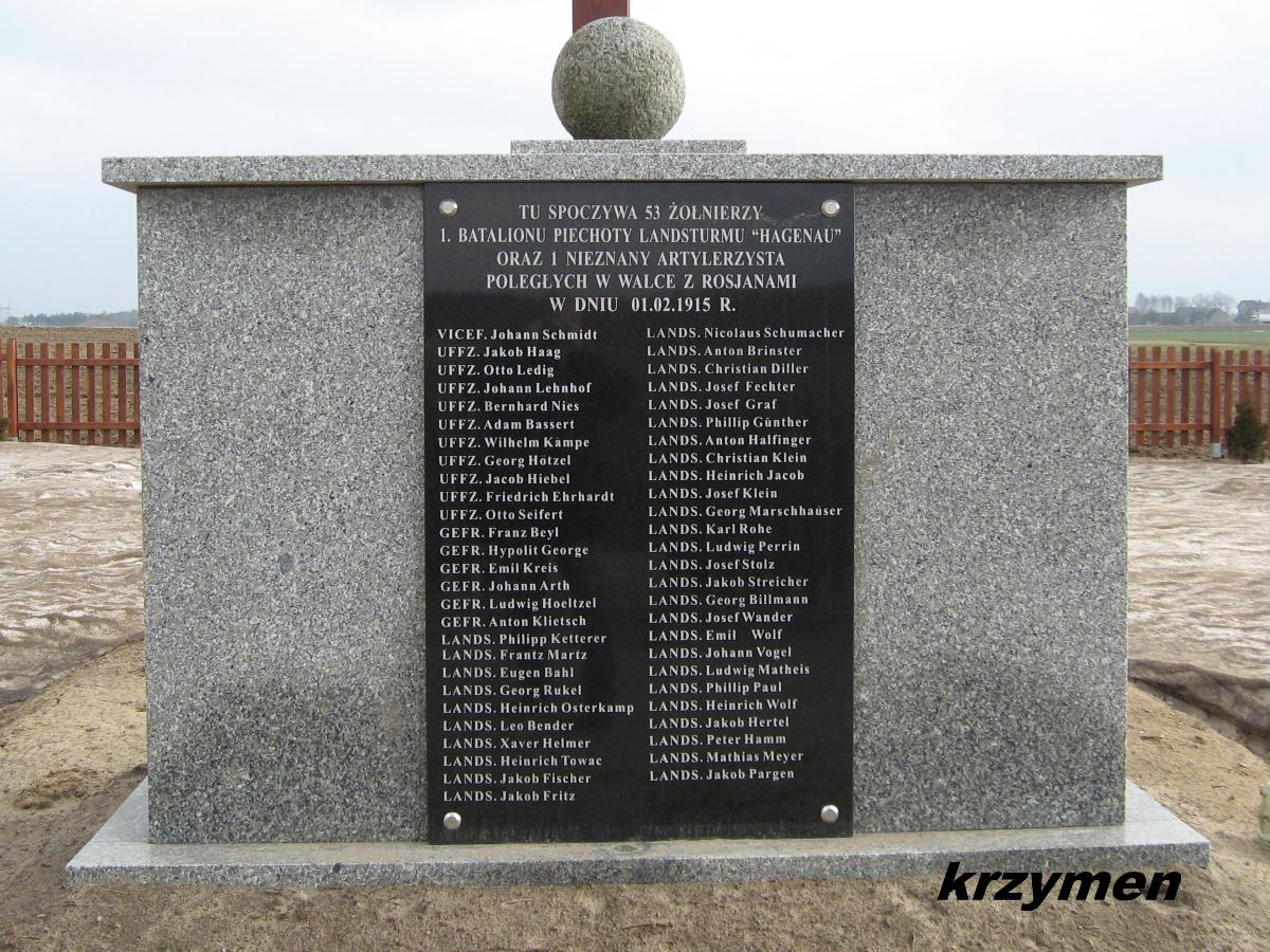 "Hier ruhen in Gott 53 deutsche Krieger vom Landstrumbatallion Hagenau und 1 Artillerist. Sie starben den Heldentod für ihr deutsches Vaterland am 1 Februar 1915. Seinen Tapferen Helden in treuen Gedenken Landst. Batl. 1 Hagenau 1.II.1916".