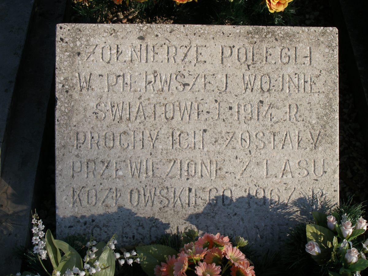 "ŻOŁNIERZE POLEGLI • W PIERWSZEJ WOJNIE • ŚWIATOWEJ 1914R. • PROCHY ICH ZOSTAŁY • PRZEWIEZIONE Z LASU • KOZŁOWSKIEGO 1967R. • CZEŚĆ ICH PAMIĘCI".