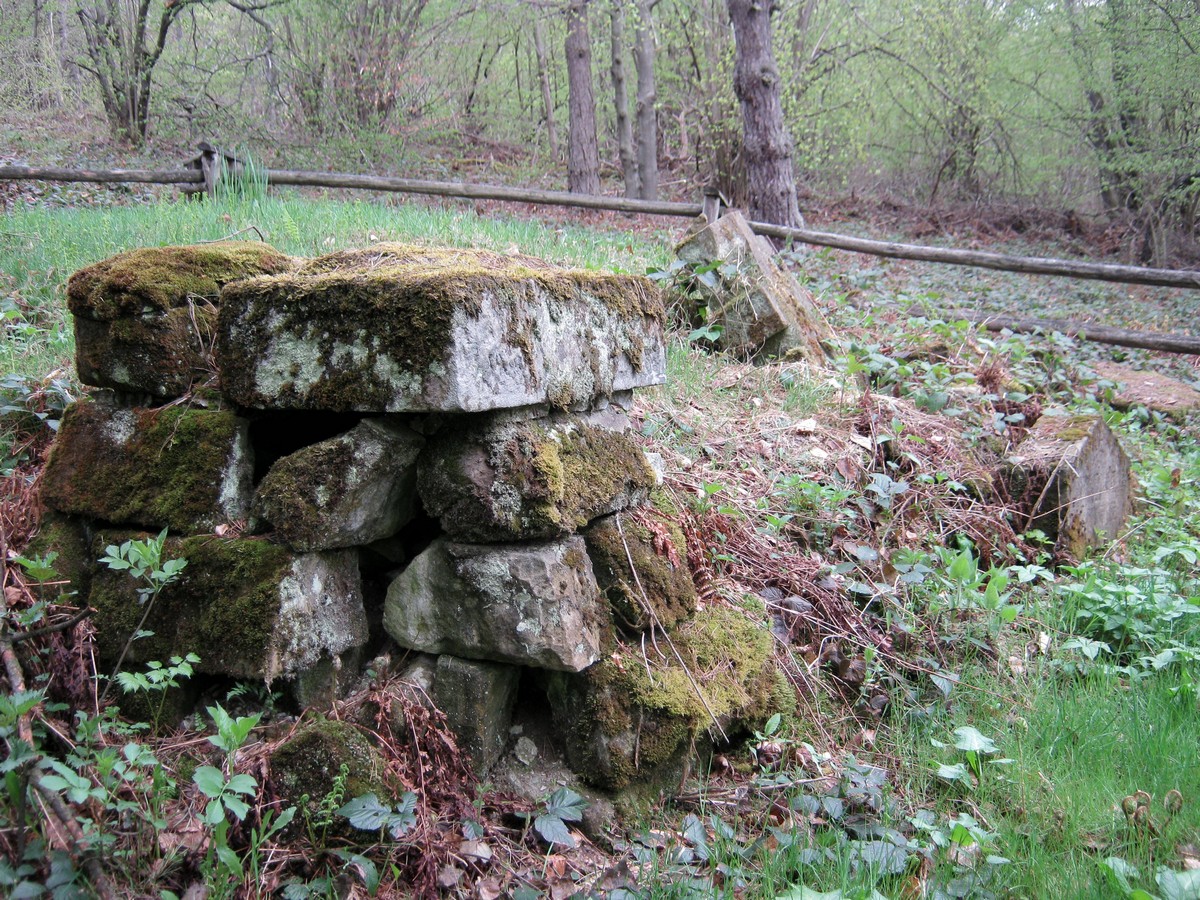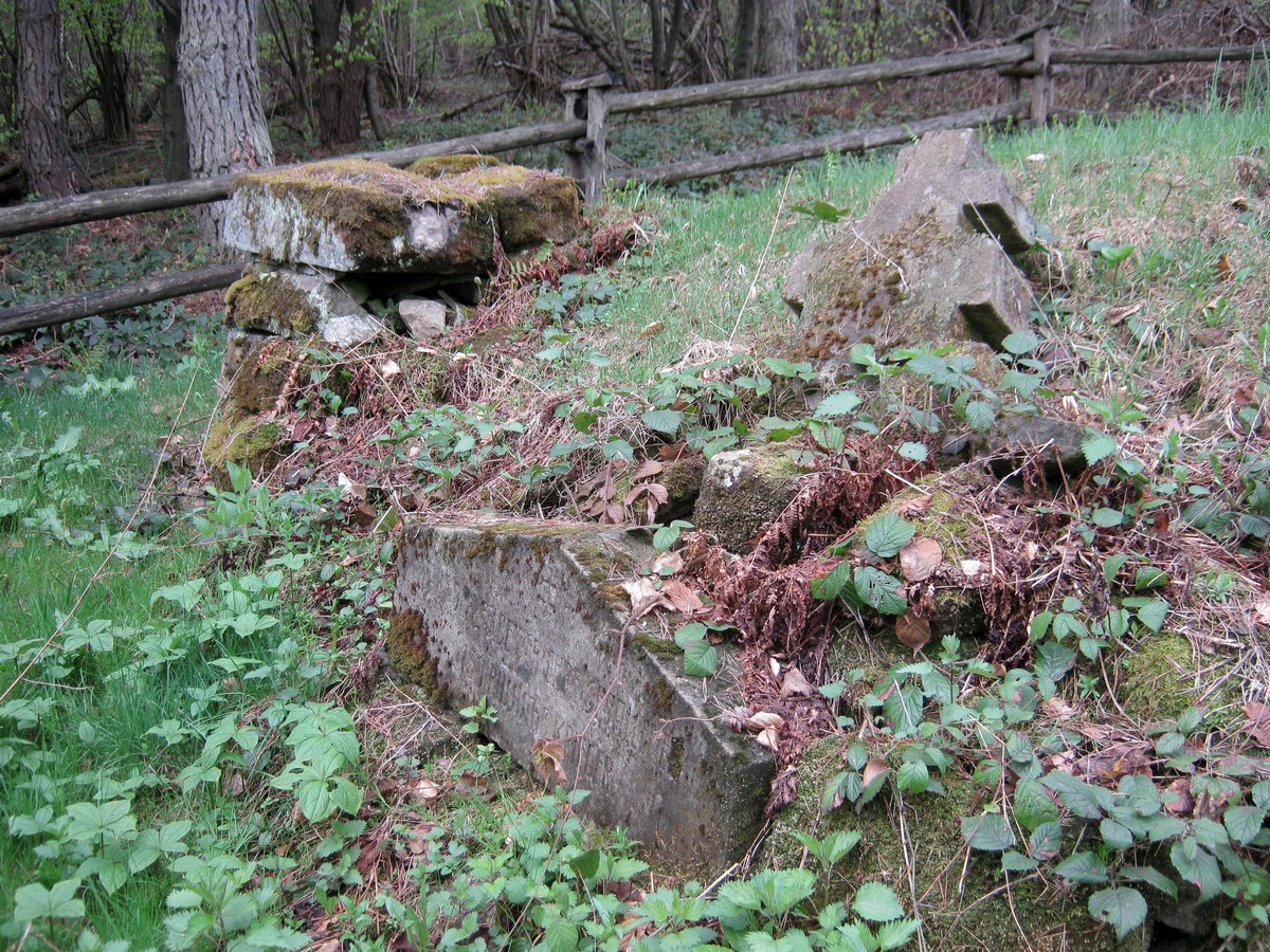 Zachował się kamienny krzyż dwuramienny oraz tablica z napisem wyrytym w piaskowcu: