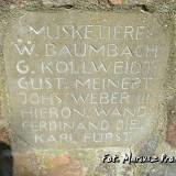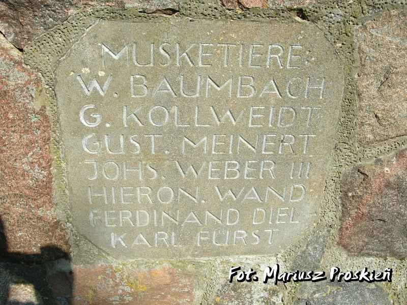 ”RES. INF. REG. 251 • ES STARBEN FÜR • DAS VATERLAND • AM 24/28 FEBRUAR • 1915 • (nazwiska 5 oficerów) • UND MIT IHNEN • 14 TAPFERE DEUTSCHE KRIEGER •• SIE KAMPFTEN STARBEN U. RUHEN VEREINT • IN FRENDER ERDE GEBETTET VOM FEIND”.1)