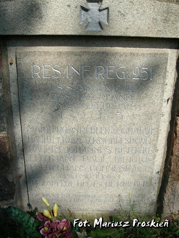 251 REZERWOWY PUŁK PIECHOTY • UMARLI ZA OJCZYZNĘ • 24/28 LUTEGO 1915 • (nazwiska 5 oficerów) • A Z NIMI • 14 DZIELNYCH NIEMIECKICH ŻOŁNIERZY •• WALCZYLI, UMIERALI I SPOCZĘLI RAZEM • W OBCEJ ZIEMI POCHOWANI PRZEZ NIEPRZYJACIÓŁ