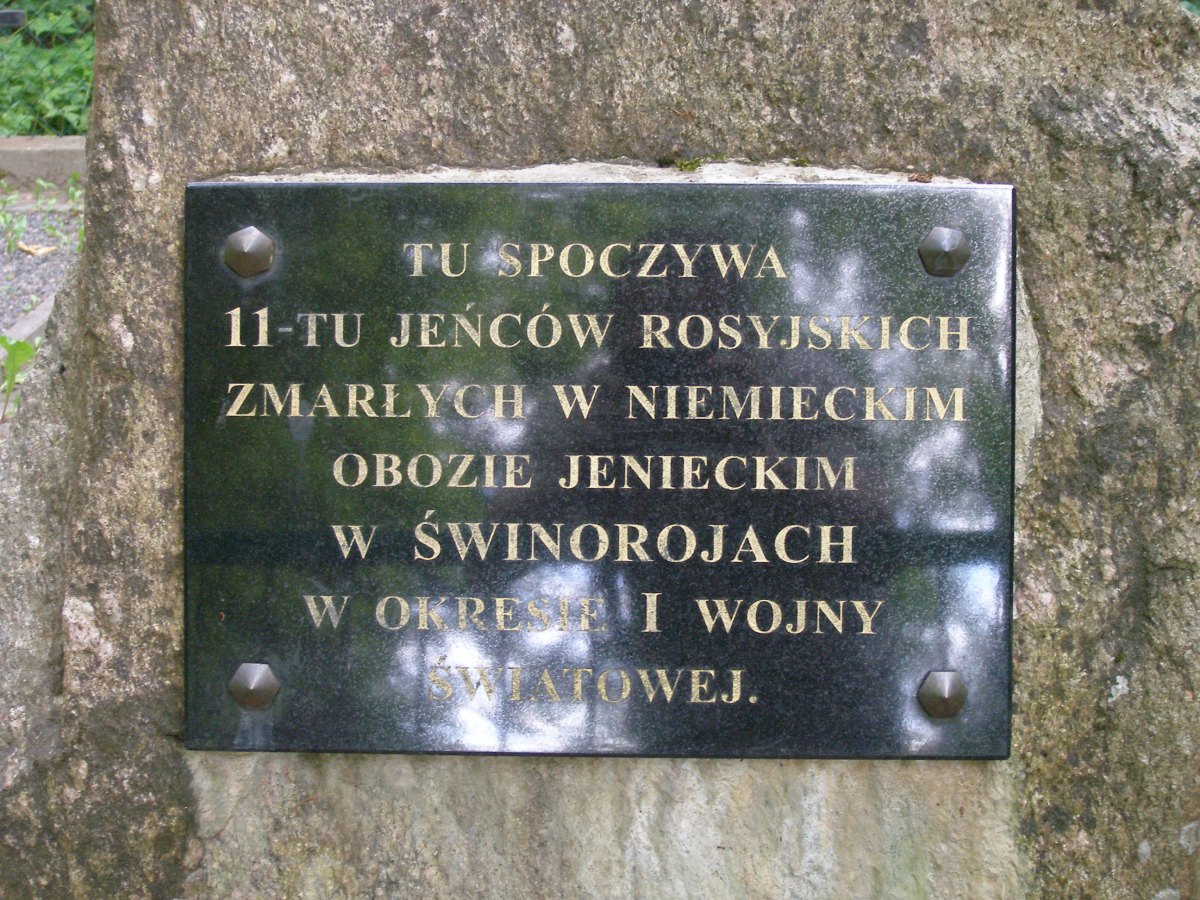 "Tu spoczywa • 11-tu jeńców rosyjskich • zmarłych w niemieckim • obozie jenieckim • w Świnorojach • w okresie I wojny • światowej".