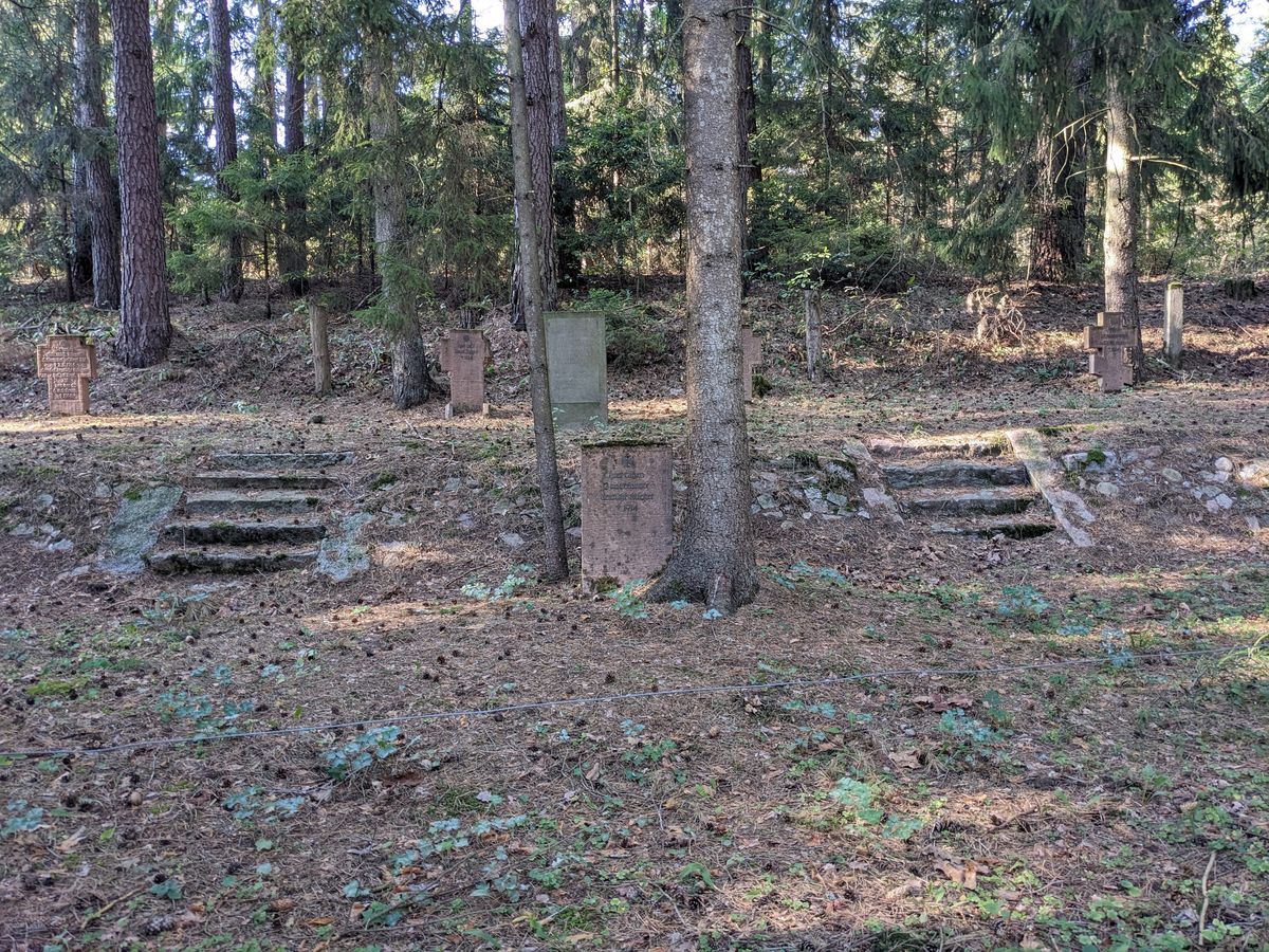 Położony w lesie na skraju rozlewiska (według opracowania Maxa Dehnena Waldfriedhof, wg Webera Ehrenfriedhof). Weber podaje, iż na terenie cmentarza spoczęło 33 żołnierzy armii niemieckiej i 17 żołnierzy armii rosyjskiej, natomiast Dehnen odpowiednio - 29 i 37.
