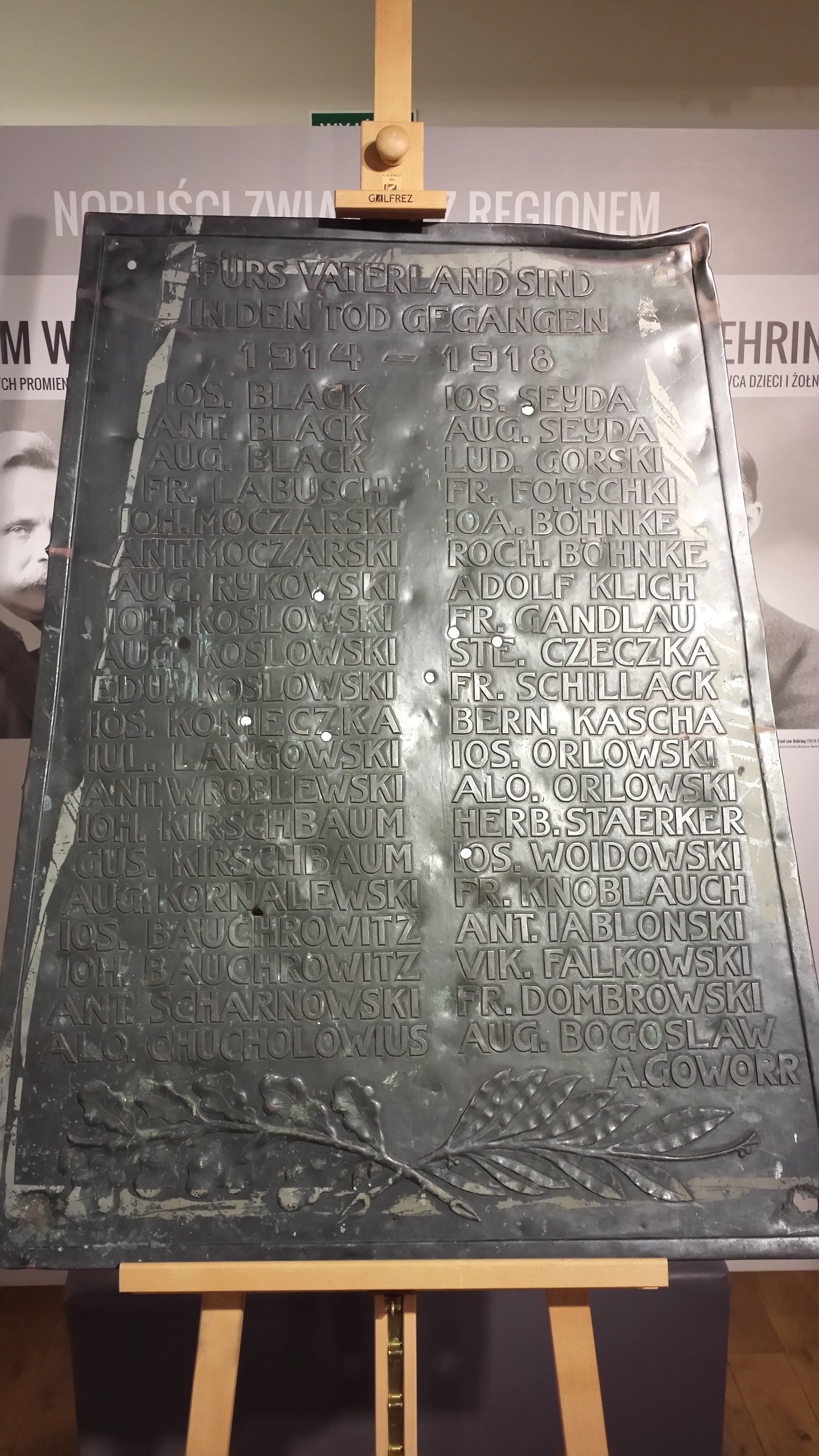 FÜRS VATERLAND SIND IN DEN TOD GEGANGEN 1914-1918 JOS. BLACK ANT. BLACK AUG. BLACK FR. LABUSCH JOH. MOCZARSKI ANT. MOCZARSKI AUG. RYKOWSKI JOH. KOSLOWSKI AUG. KOSLOWSKI EDU. KOSLOWSKI JOS. KONIECZKA JUL. LANGOWSKI ANT. WROBLEWSKI JOH. KIRSCHBAUM GUS. KIRSCHBAUM AUG. KORNALEWSKI JOS. BAUCHROWITZ JOH. BAUCHROWITZ ANT. SCHARNOWSKI ALO. CHUCHOLOWIUS JOS. SEYDA AUG. SEYDA LUD. GORSKI FR. FOTSCHKI JOA. BÖHNKE ROCH. BÖHNKE ADOLF KLICH FR. GANDLAU STE. CZECZKA FR. SCHILLACK BERN. KASCHA JOS. ORLOWSKI ALO. ORLOWSKI HERB. STAERKER JOS. WOIDOWSKI FR. KNOBLAUCH ANT. JABLONSKI VIK. FALKOWSKI FR. DOMBROWSKI AUG. BOGOSLAW A. GOWORR