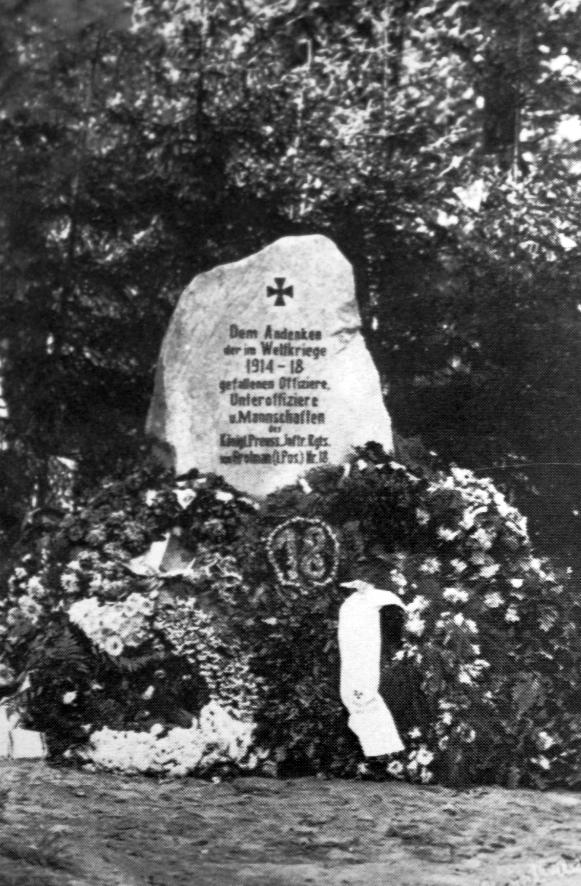 Pomnik znajdował się przy zbiegu ul. Mickiewicza i ul. Olsztyńskiej. Odsłonięty 26.8.1923 r. Upamiętniał żołnierzy 18. (1. poznańskiego) pułku piechoty im. von Grolmana (1. Posensches Infanterie-Regiment "von Grolman" Nr. 18), poległych w czasie I wojny światowej.