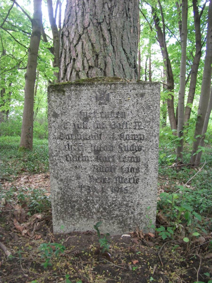 Poniżej przytwierdzona współcześnie granitowa tablica z napisem: "DENKMAL FÜR GEFALLENEN 1914-1918 POMNIK KU PAMIĘCI POLEGŁYCH W WOJNIE". Na bocznych ścianach tablice z nazwiskami poległych oraz kolejna współczesna, granitowa tablica: