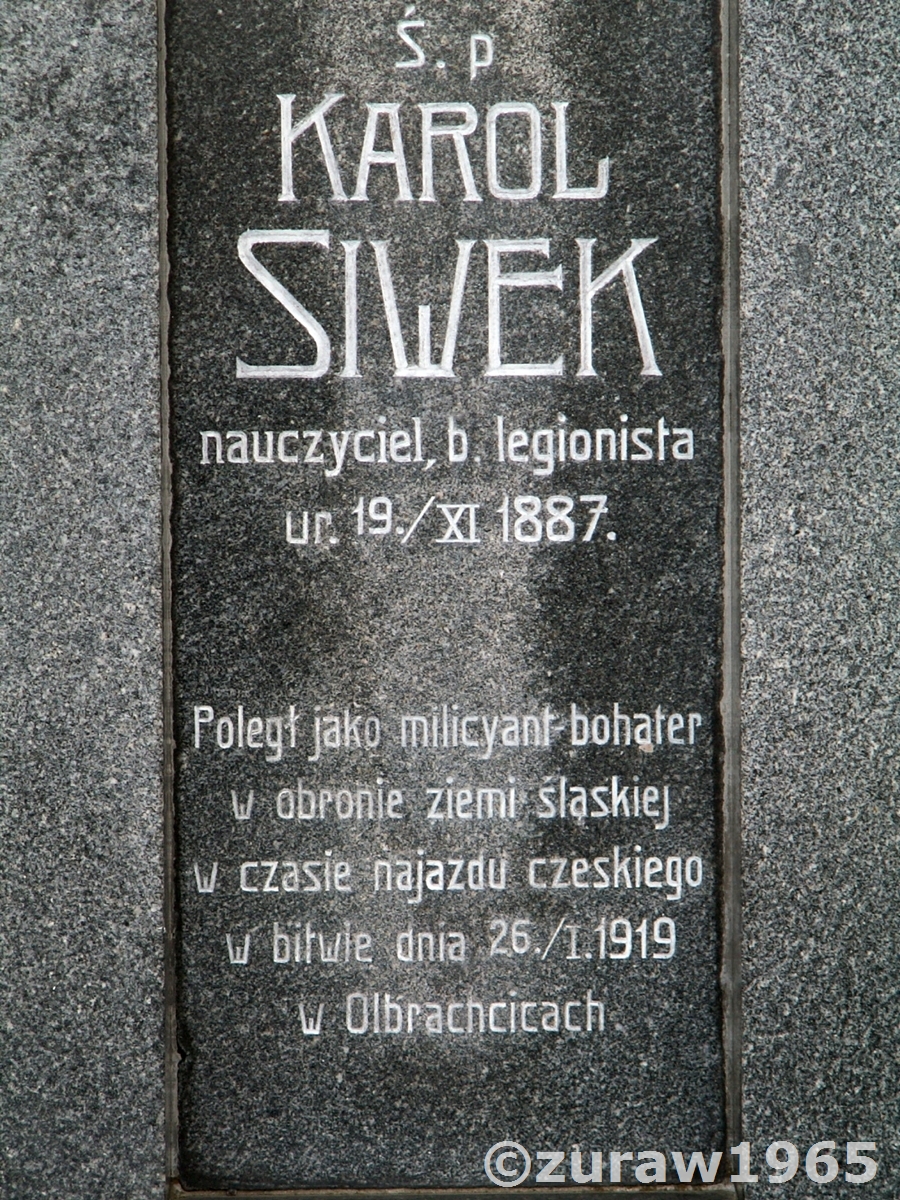 "Ś.p. • KAROL • SIWEK • nauczyciel, b. legionista • ur. 19./XI 1887. • Poległ jako milicyant bohater • w obronie ziemi śląskiej • w czasie najazdu czeskiego • w bitwie dnia 26./I.1919 • w Olbrachcicach".