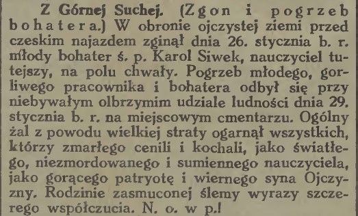 Karol Siwek urodził się 19.11.1887 w Suchej Górnej. Był nauczycielem na Śląsku Cieszyńskim – pracował najpierw w Polskiej Ostrawie, a potem Gruszowie. Należał do Macierzy Szkolnej Księstwa Cieszyńskiego, działał również w Towarzystwie Gimnastycznym „Sokół”. W 1914 r. zaciągnął się do Legionu Śląskiego, który niebawem został włączony do 3 pułku piechoty Legionów Polskich. Od września 1914 służył w 2. komp. I baonu 3. pp LP. Ranny w Karpatach. Awansowany do stopnia sierżanta. W 1917 r. powrócił na Śląsk Cieszyński – w tym czasie został mianowany stałym nauczycielem w Gruszowie. W 1918 r. wstąpił do Milicji Polskiej Księstwa Cieszyńskiego. Podczas wojny polsko-czeskiej wziął udział w walkach w okolicach Żywocic, Górnej Suchej, Olbrachcic i Cierlicka. Poległ 26 stycznia 1919 r. w walkach nad rzeką Stonawką w Olbrachcicach. Trzy dni później został pochowany w rodzinnej Suchej Górnej. W pogrzebie wzięło udział około 5 tysięcy osób.