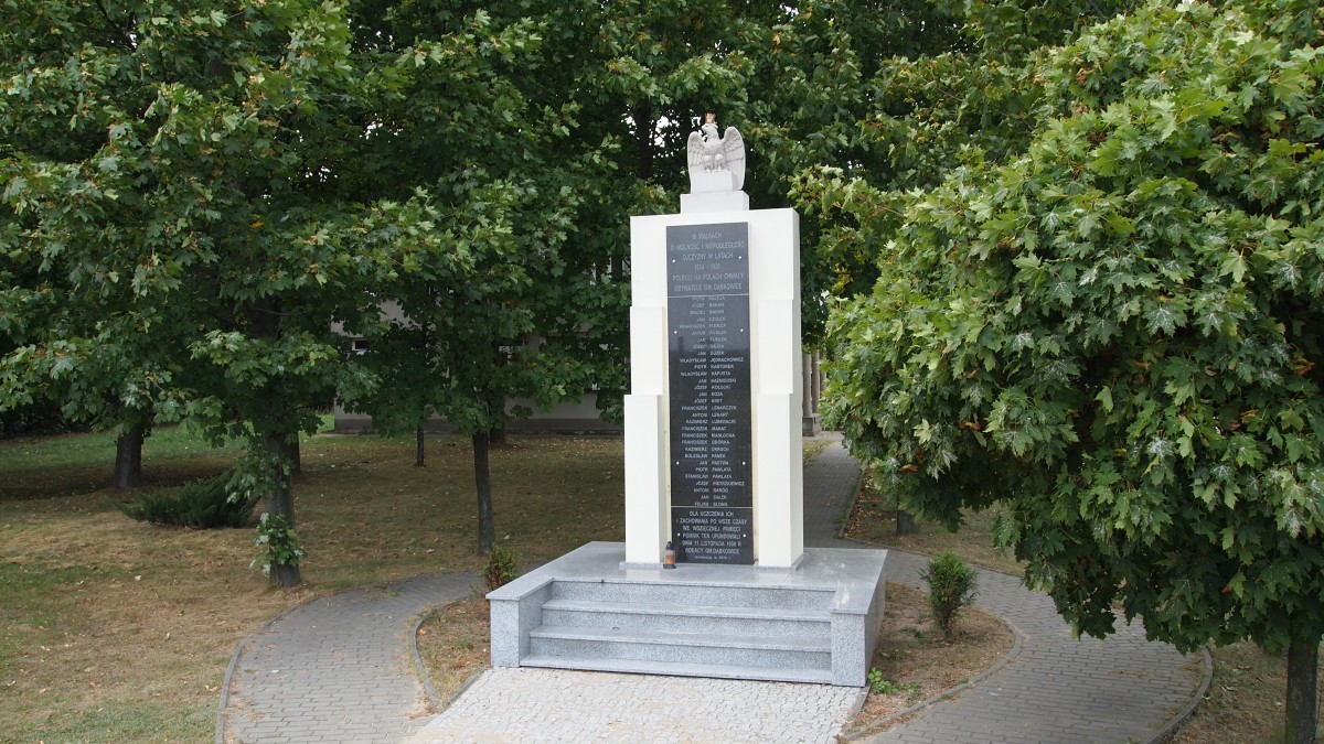 "W WALKACH • O • WOLNOŚĆ I NIEPODLEGŁOŚĆ • OJCZYZNY W LATACH • 1918-1920 • POLEGLI NA POLACH CHWAŁY • OBYWATELE GM. DĄBKOWICE •• DLA UCZCZENIA ICH PAMIĘCI • I ZACHOWANIA PO WSZE CZASY • WE WDZIĘCZNEJ PAMIĘCI • POMNIK TEN UFUNDOWALI • DNIA 11 LISTOPADA 1938 R. • RODACY GM. DĄBKOWICE".