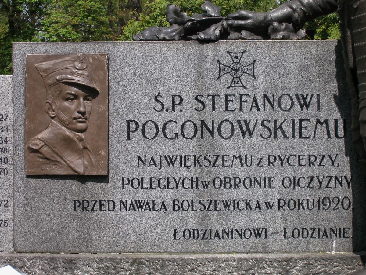 "STEFANOWI • POGONOWSKIEMU • NAJWIĘKSZEMU Z RYCERZY, • POLEGŁYCH W OBRONIE OJCZYZNY • PRZED NAWAŁĄ BOLSZEWICKĄ W ROKU 1920. • Łodzianinowi - Łodzianie".