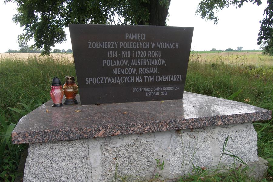 "PAMIĘCI • ŻOŁNIERZY POLEGŁYCH W WOJNACH • 1914-18 i 1920 ROKU • POLAKÓW, AUSTRYJAKÓW, • NIEMCÓW, ROSJAN, • SPOCZYWAJĄCYCH NA TYM CMENTARZU •• SPOŁECZNOŚĆ GMINY DOROHUSK • LISTOPAD 2001".