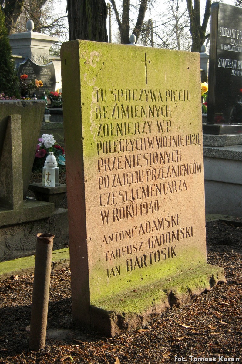 "† • TU SPOCZYWA PIĘCIU • BEZIMIENNYCH • ŻOŁNIERZY W.P. • POLEGŁYCH W WOJNIE 1920 • PRZENIESIONYCH • PO ZAJĘCIU PRZEZ NIEMCÓW • CZĘŚCI CMENTARZA • W ROKU 1940 •• ANTONI ADAMSKI • TADEUSZ GADOMSKI • JAN BARTOSIK".