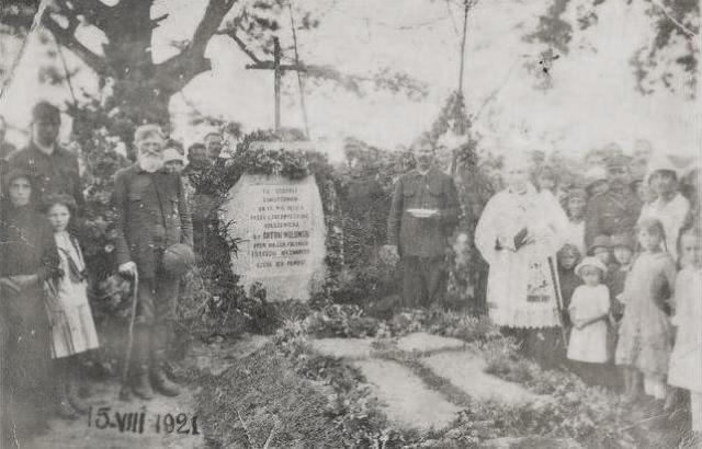 "TU ZOSTALI • ZAMORDOWANI • DN. 17.VIII.1920 R. • PRZEZ CZ(E)REZWYCZAJKĘ • BOLSZEWICKĄ • Ś.P. ANTONI WOŁOWSKI • PPOR. WOJSK POLSKICH • I SZEŚCIU NIEZNANYCH •• CZEŚĆ ICH PAMIĘCI”.