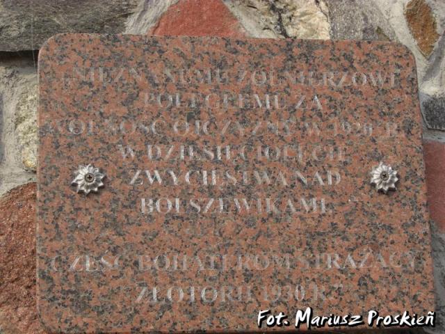 "NIEZNANEMU ŻOŁNIERZOWI • POLEGŁEMU ZA • WOLNOŚĆ OJCZYZNY • W 1920 R. • W DZIESIĘCIOLECIE • ZWYCIĘSTWA NAD • BOLSZEWIKAMI • CZEŚĆ BOHATEROM STRAŻACY • ZŁOTORII 1930 R".