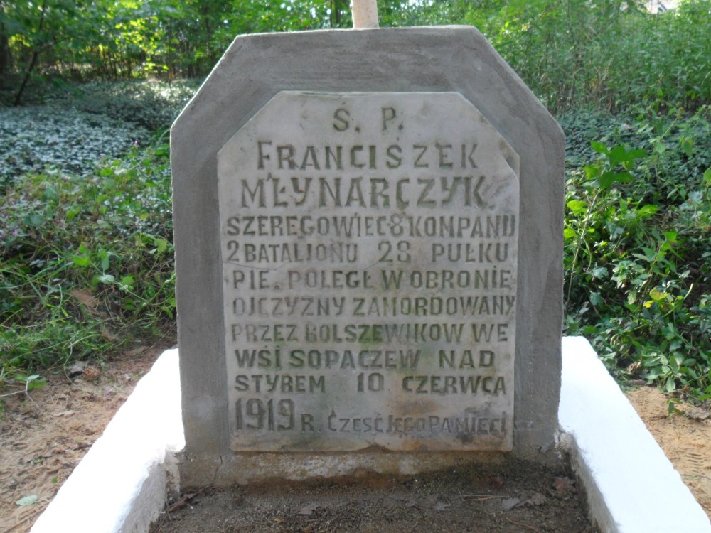 "Ś.P. • FRANCISZEK • MŁYNARCZYK • SZEREGOWIEC 8 KOMPANII • 2 BATALIONU 28 PUŁKU • PIE. POLEGŁ W OBRONIE • OJCZYZNY ZAMORDOWANY • PRZEZ BOLSZEWIKÓW WE • WSI SOPACZEW NAD • STYREM 10 CZERWCA • 1919r. •• CZEŚĆ JEGO PAMIĘCI".