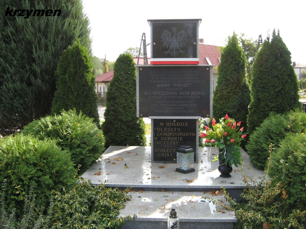 "MIEJSCE WIECZNEGO SPOCZYNKU • ŻOŁNIERZY WOJSKA POLSKIEGO • 43 PP STRZELCÓW BAJOŃSKICH • 13 RÓWIEŃSKIEJ DYWIZJI PIECHOTY • ARMII "PRUSY" • POLEGŁYCH • 6-7 WRZEŚNIA 1939 ROKU • W WALCE Z NIEMIECKIM NAJEŹDŹCĄ • PUŁK POD DOWÓDZTWEM • PPŁK. FRANCISZKA KUBICKIEGO • ODZNACZONY • ORDEREM "VIRTUTI MILITARI".