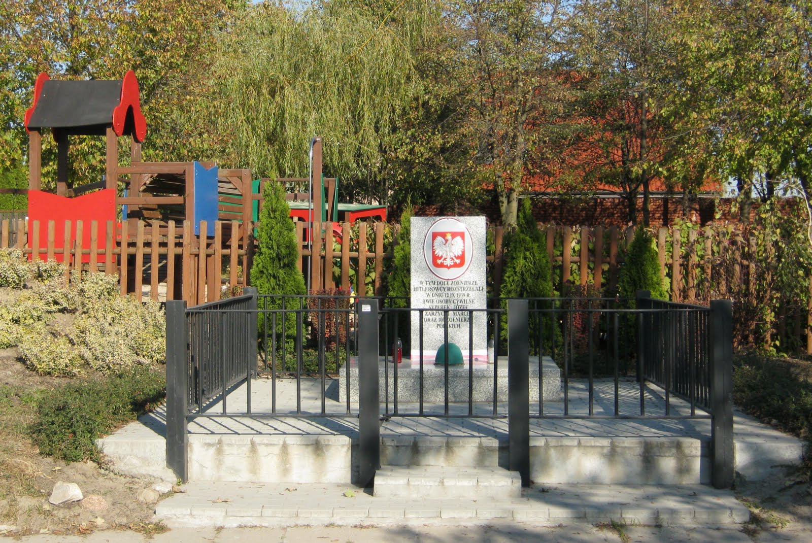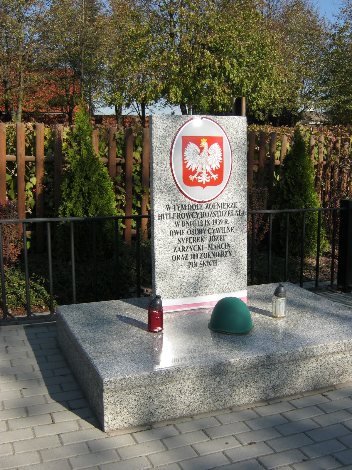 "W TYM DOLE ŻOŁNIERZE • HITLEROWSCY ROZSTRZELALI • W DNIU 12 IX 1939 R. • DWIE OSOBY CYWILNE • SYPEREK JÓZEF • ZARZYCKI MARCIN • ORAZ 100 ŻOŁNIERZY • POLSKICH".