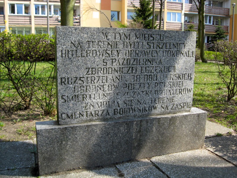 "W TYM MIEJSCU • NA TERENIE BYŁEJ STRZELNICY • HITLEROWSCY OPRAWCY DOKONALI • 5 PAŹDZIERNIKA • ZBRODNICZEJ EGZEKUCJI • ROZSTRZELANIA 38 BOHATERSKICH • OBROŃCÓW POCZTY POLSKIEJ • ŚMIERTELNE SZCZĄTKI BOHATERÓW • ZNAJDUJĄ SIĘ NA TERENIE • CMENTARZA BOJOWNIKÓW NA ZASPIE"