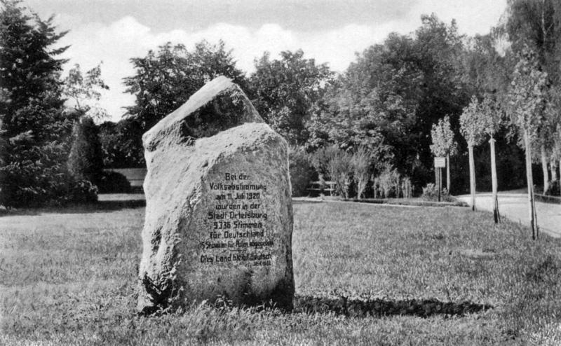 Inskrypcja: "Bei der • Volksabstimmung • am 11. Juli 1920 • wurden in der • Stadt Ortelsburg • 5336 Stimmen • für Deutschland • 15 Stimmen für Polen abgegeben.• Dies Land bleibt deutsch".