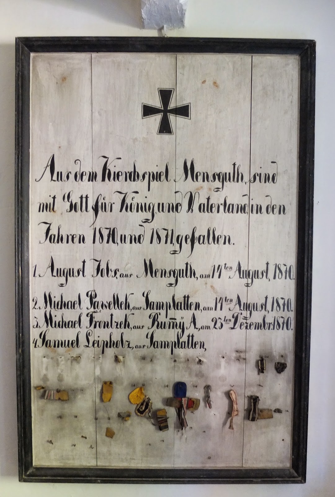 Aus dem Kirchspiel Mensguth sind mit Gott für König und Vaterland in den Jahren 1870 und 1871 gefallen. 1. August Jobs aus Mensguth, den 14-ten August 1870 2. Michael Pawellek aus Samplatten, den 17-ten August 1870 3. Michael Frontzek aus Rummy, den 25-ten Setembr. 1870 4. Samuel Leipholz aus Samplatten
