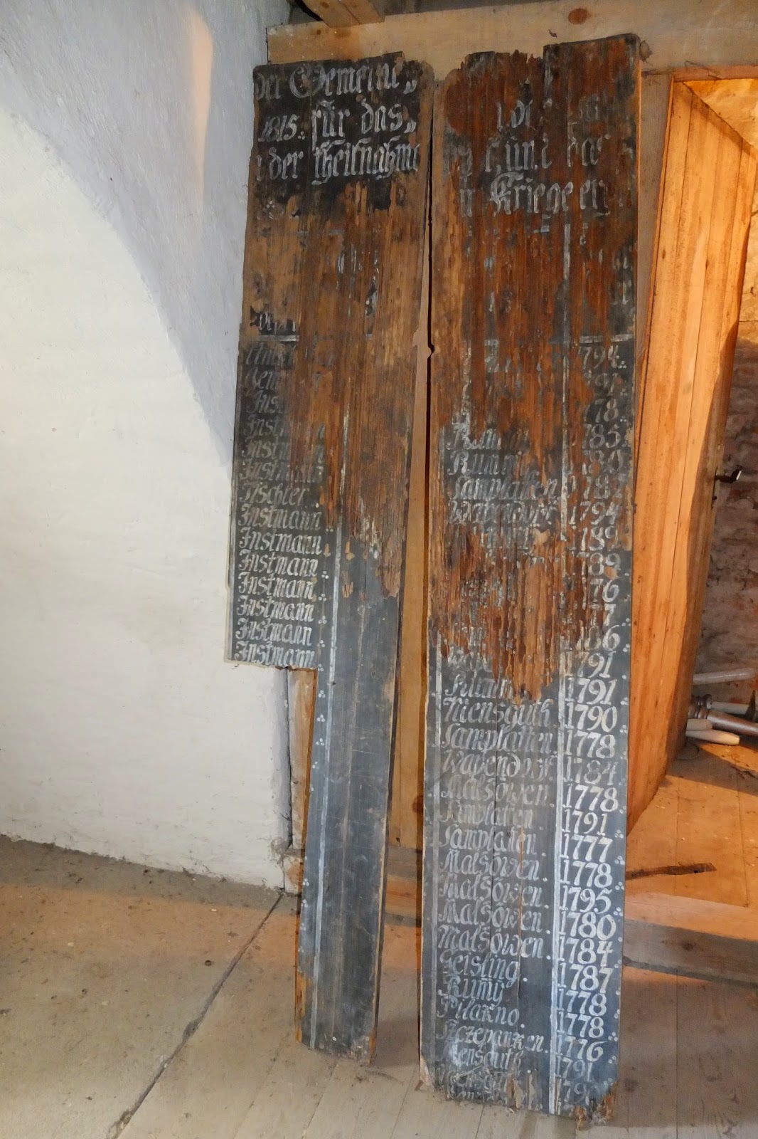 W miejscowym kościele ewangelickim znajdują się dwie tablice. Najstarsza, mocno zniszczona - zachowane 3 rozdzielone deski z częściowo zatartymi inskrypcjami. Tablica upamiętnia prawdopodobnie ok. 30 żołnierzy poległych w czasie wojen napoleońskich. Najlepiej zachowana część znajduje się w zakrystii, pozostałe przy wejściu na wieżę. Druga tablica poświęcona jest poległym w latach 1870-1871, znajduje się w zakrystii. Upamiętnia mieszkańców: Dźwierzut (Mensguth), Sąpłat (Samplatten) i Rumy (Rummÿ).